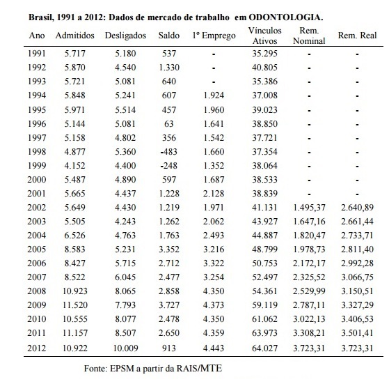 Segundo o Relatório final: estudo de levantamento de aspectos demográficos, de formação e de mercado de trabalho das profissões de saúde de nível superior no Brasil entre 1991 e 2010, a tabela abaixo evidencia os indicadores da demanda dos empregos formais, destacando a média da remuneração mensal durante o ano de 1991 a 2012 que revela, por exemplo no ano de 2012, a remuneração real dos cirurgiões-dentistas em torno de R$3.723,31.